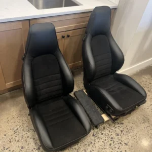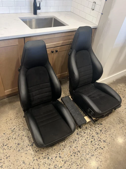 Authentic Recaro sport seats originally removed from a 1993 Porsche 911 (964), professionally refreshed with replacement pronounced sport bolsters and premium black leather and Alcantara upholstery. These power-adjustable seats deliver period-correct looks with modern comfort.