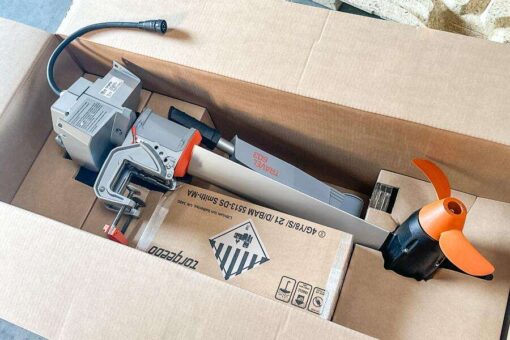 High-performance lithium battery with integrated GPS and USB connection, on-board computer display in the tiller, charger, emergency magnetic kill switch, propeller